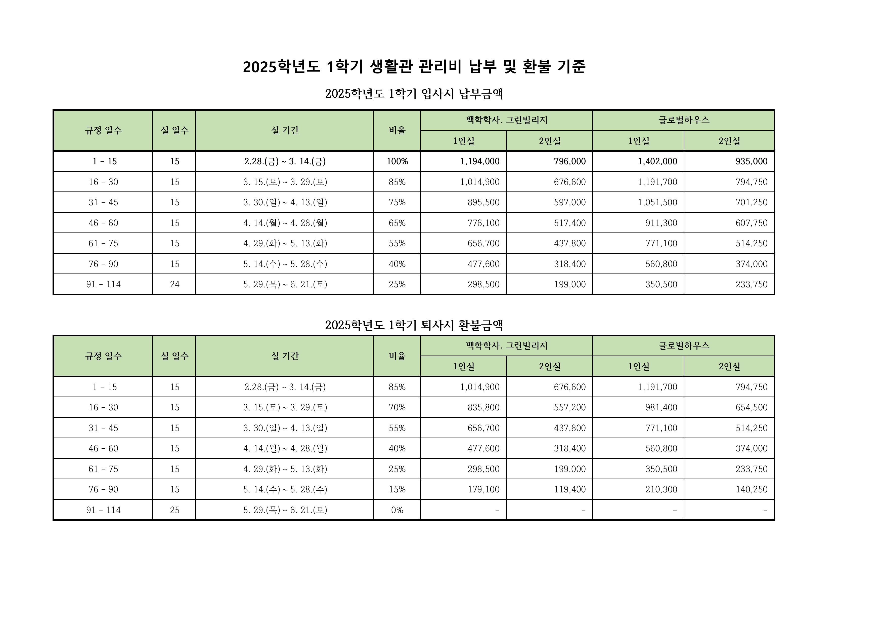 2025학년도 1학기 생활관 관리비 납부 및 환불기준표
