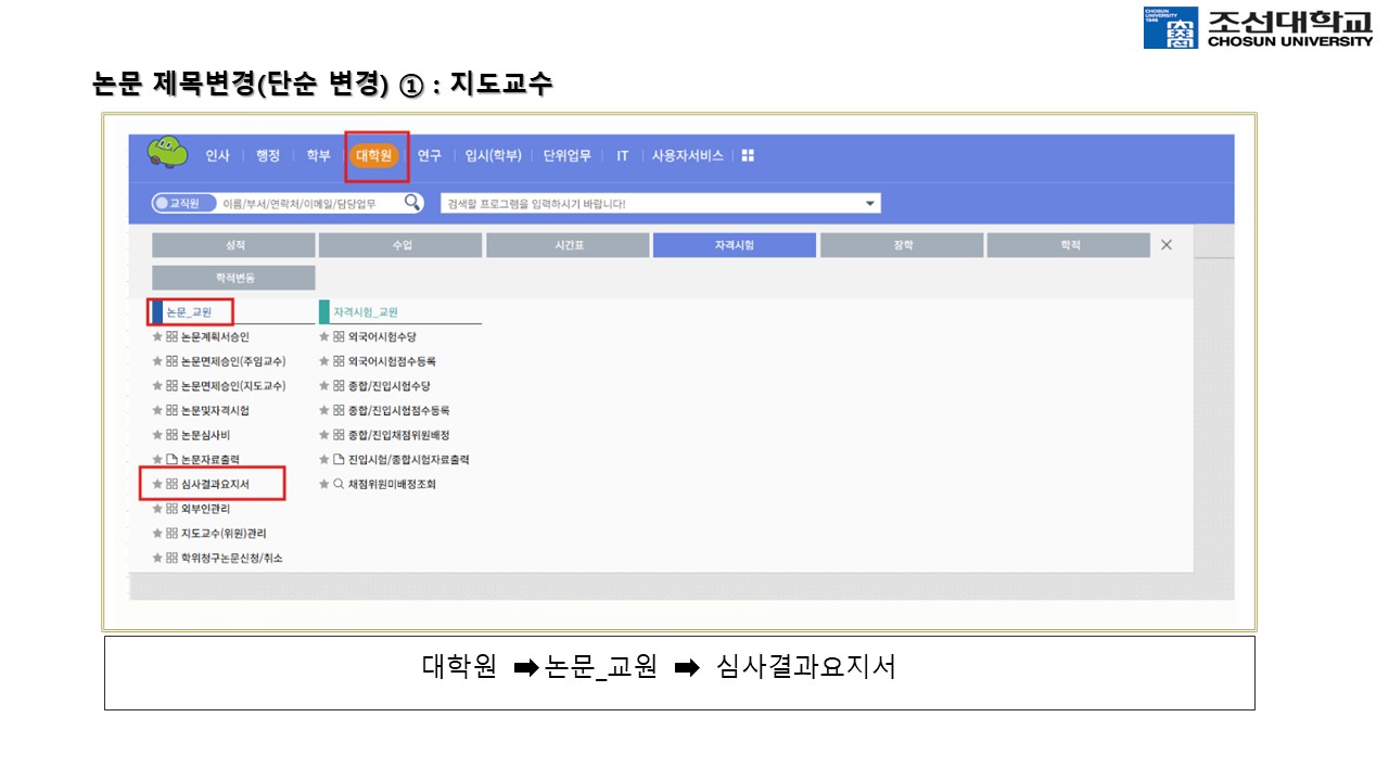 11. 최종 심사 완료 후 논문 제목이 변경된 경우에는 지도교수가 차세대종합정보시스템에서 대학원-> 논문_교원 -> 심사결과요지서