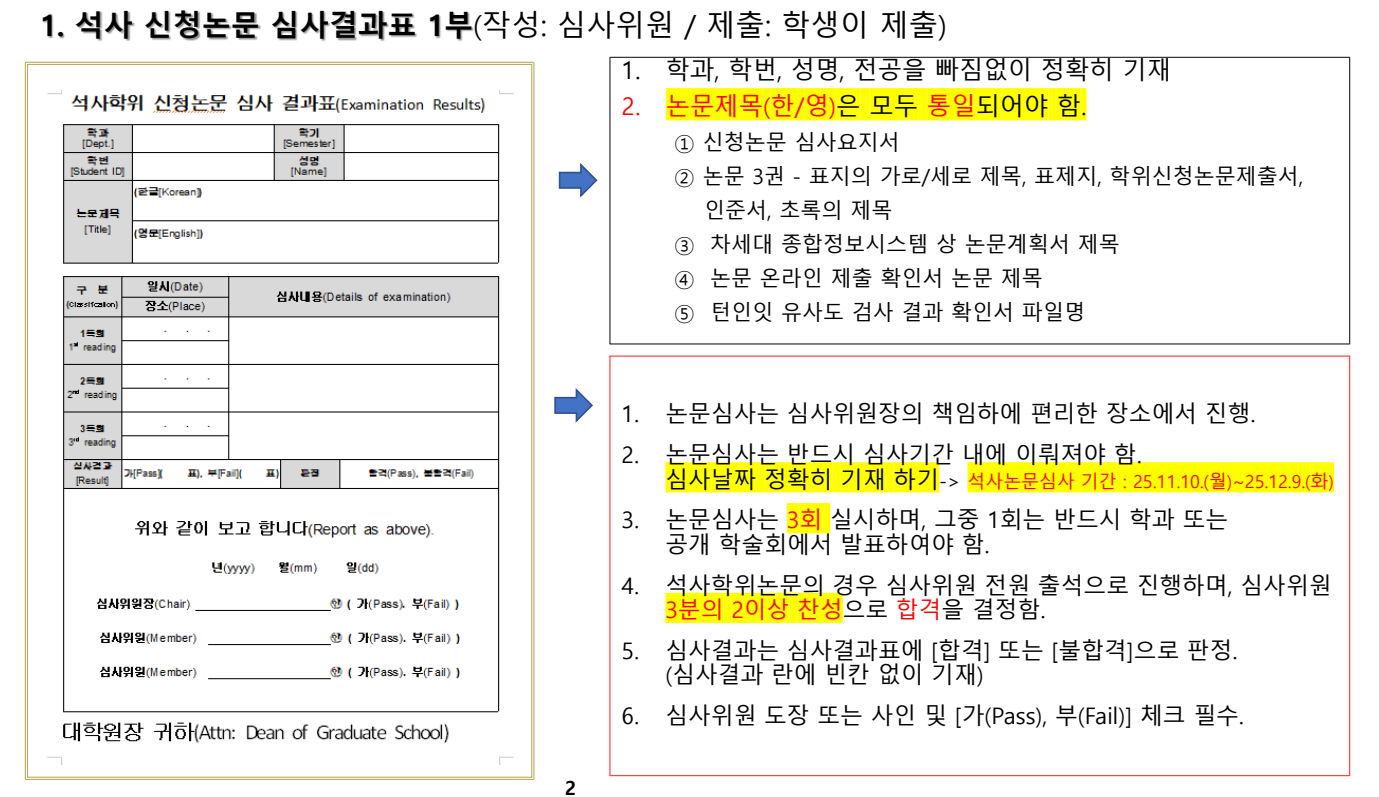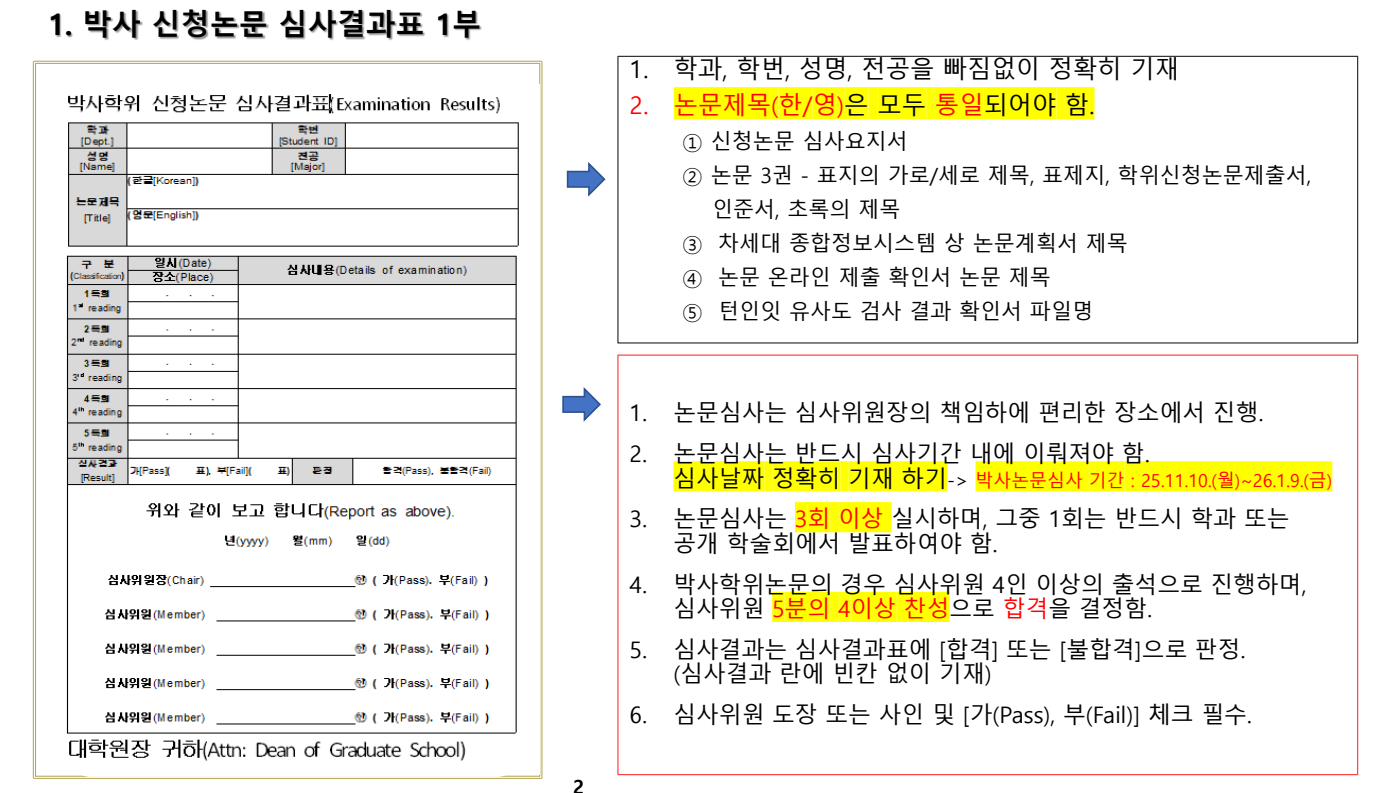 - 석사: 2025. 11. 10.(월) ~ 2025. 12. 09.(화) - 박사: 2025. 11. 10.(월) ~ 2026. 01. 09.(금) * 논문 심사결과표의 일시는 반드시 해당 학위별 심사 기간 내만 인정