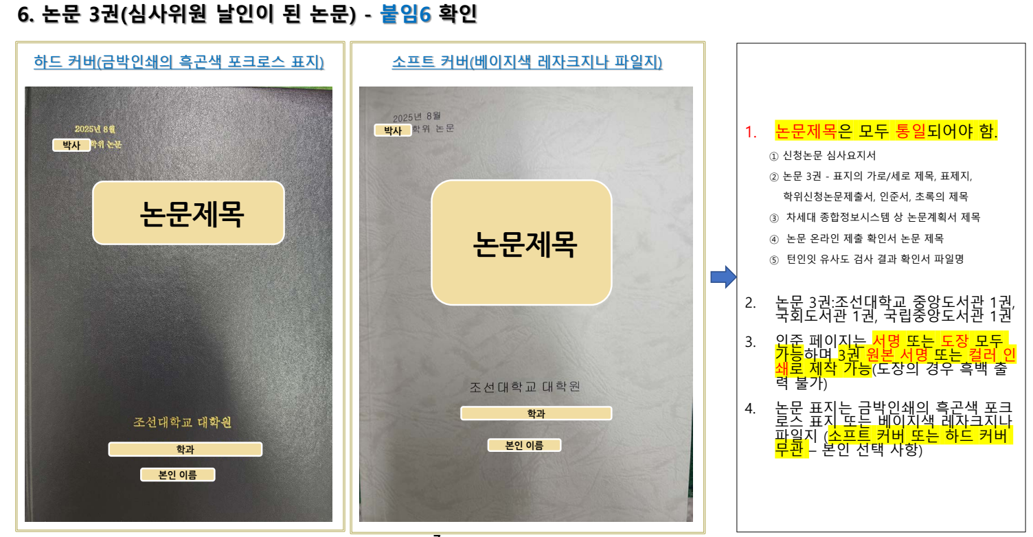1. (붙임2)학위 신청 논문 심사결과표 1부. 2. (붙임2)학위 신청 논문 심사요지서 1부. 3. (붙임3)학위 논문 온라인 제출확인서 1부. 4. (붙임4)석.박사학위 논문 유사도 검사결과서 1부. (유사도율20%이상인 자는 (붙임7)논문 유사도 검사 결과 확인서에 반드시 사유를 기재) 5. (붙임5)Turninit 턴잇인 논문 유사도 검사 결과 확인서. [*표지:제출일자,제출자,파일명 표기/*유사도 페이지 전체 출력(본인 논문 부분은 제외): 총 유사도율이 나온 첫 페이지 우측 상단에 지도교수 날인(도장 또는 서명)] 6. (붙임6)심사위원 날인이 된 논문 3 7. (붙임9)박사학위 온라인조사 완료증(한국직업능력연구원) 1부. 8. 박사 연구실적물 제출(논문 접수 시 게재예정증명서 제출자에 한함) 1부. 9. 외부 심사위원 승낙서(논문신청 시 미제출자) 1부.